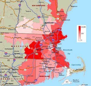 Maps are fun, informative and sometimes great for making a point. Add data to maps and you have information squared. Here is a map of Eastern Massachusetts and surrounding areas broken out into 3-digit zip code areas.